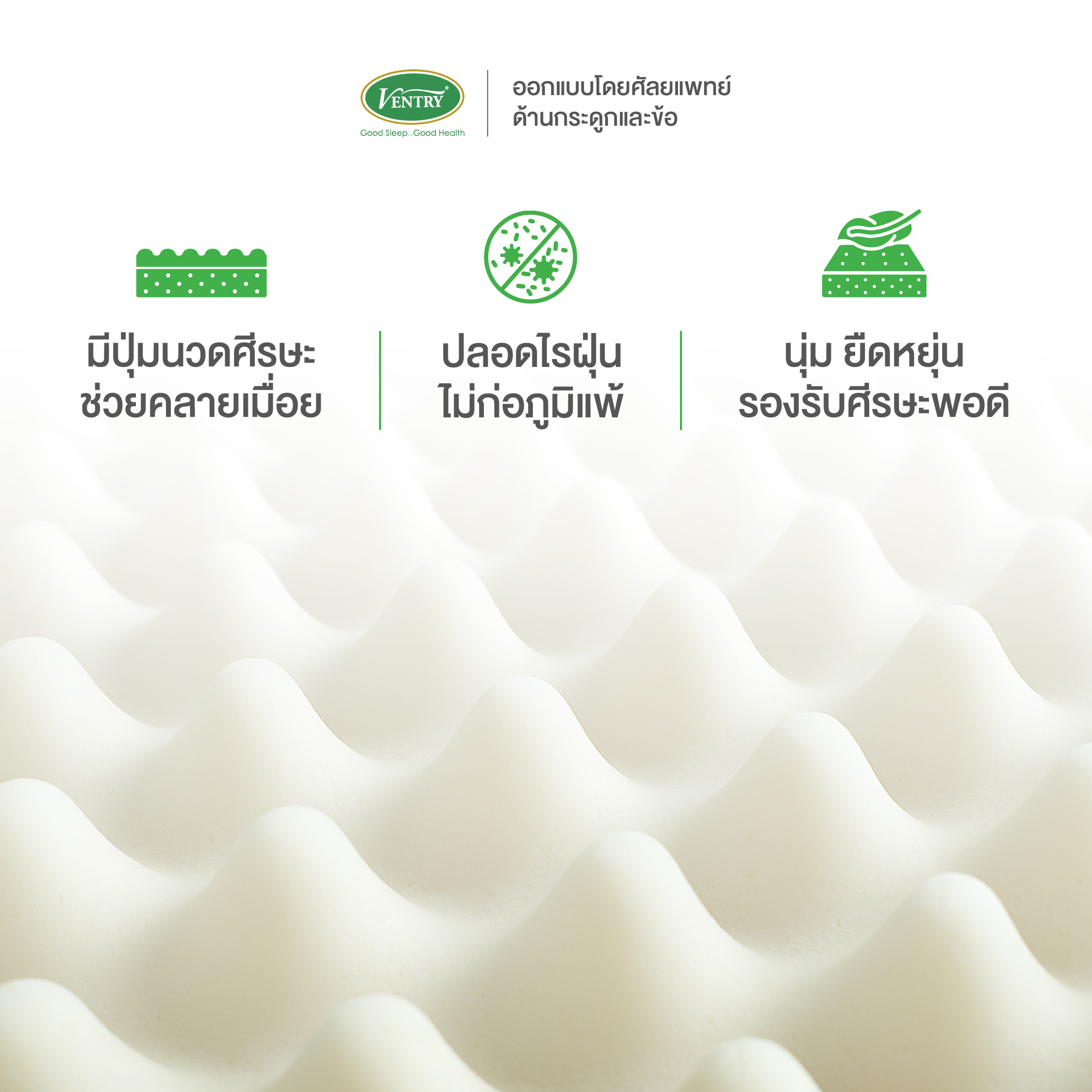 Made from 100% natural latex. Designed to have special curves to support head and neck. Design with massage knobs to help muscle relax. The knobs help massage blood veins around the neck and head and increase blood circulation during to the brain sleep. Made from 100% natural latex. Durable with good elasticity.